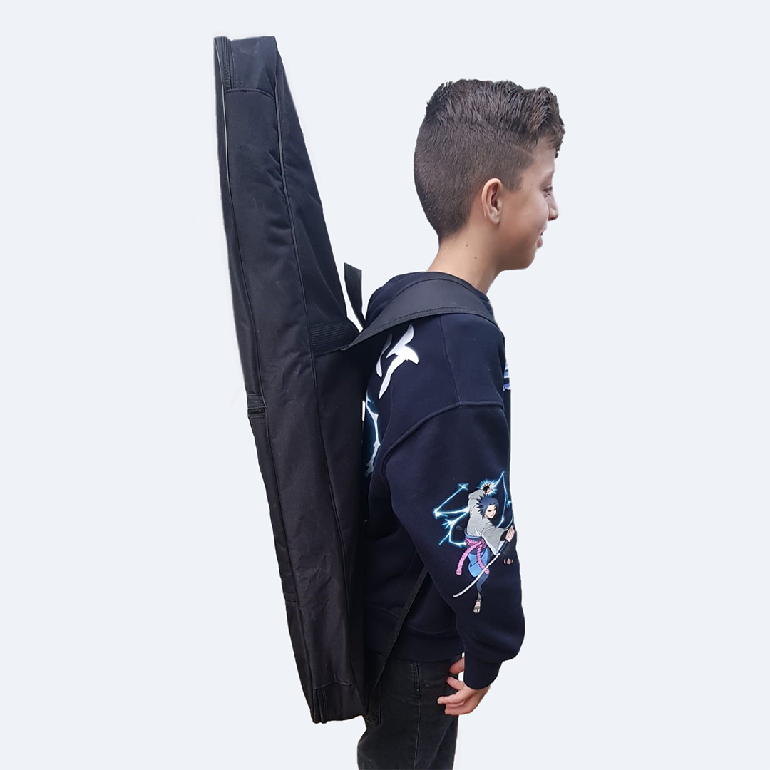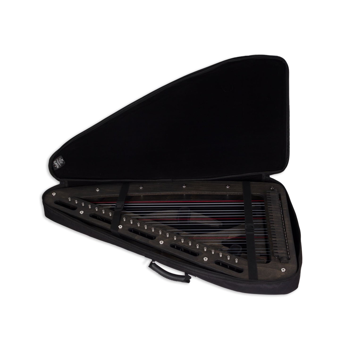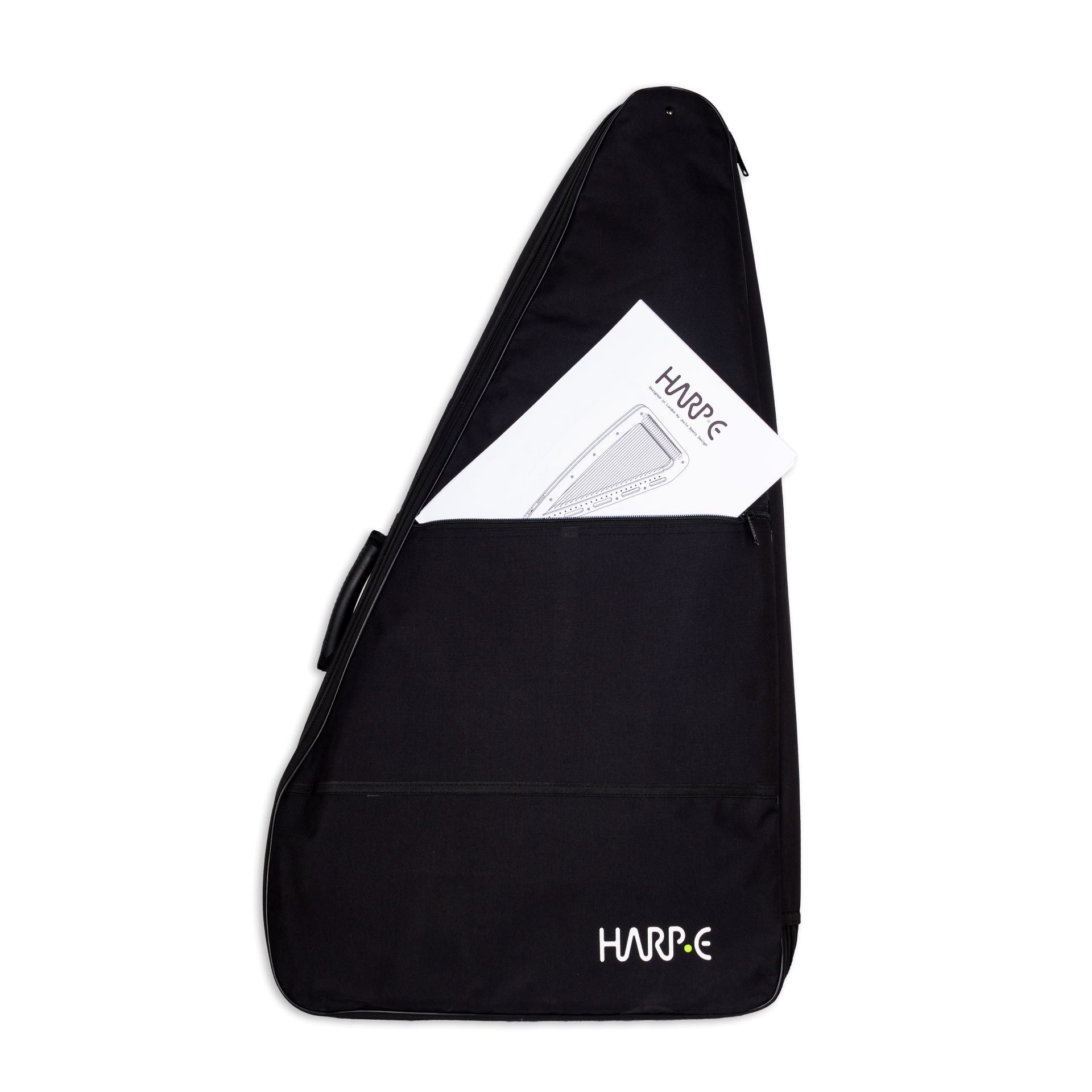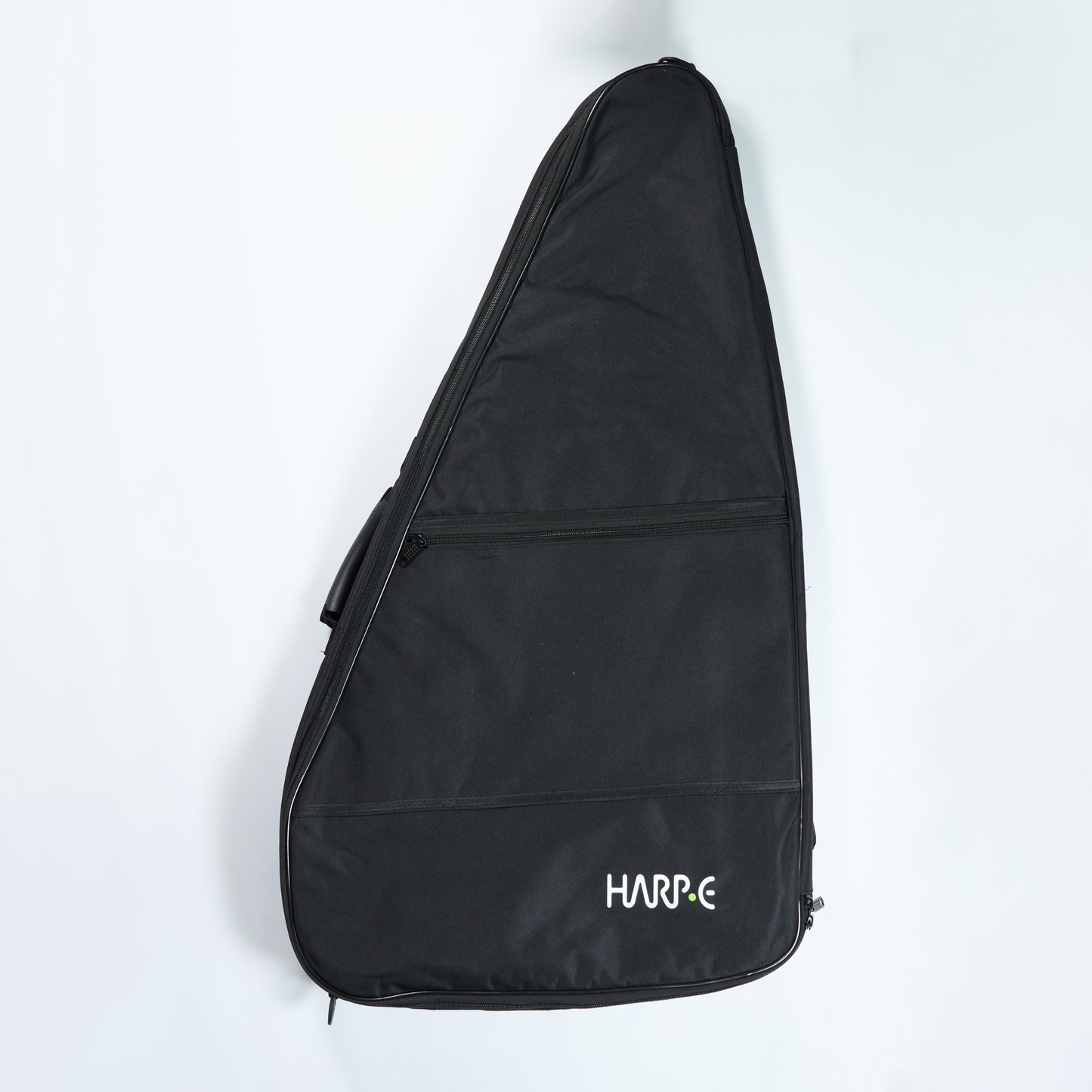 A sturdy fabric carrier with a handle to carry as a bag and two comfortable straps to wear as a backpack. Fits snugly around the harp and stand.