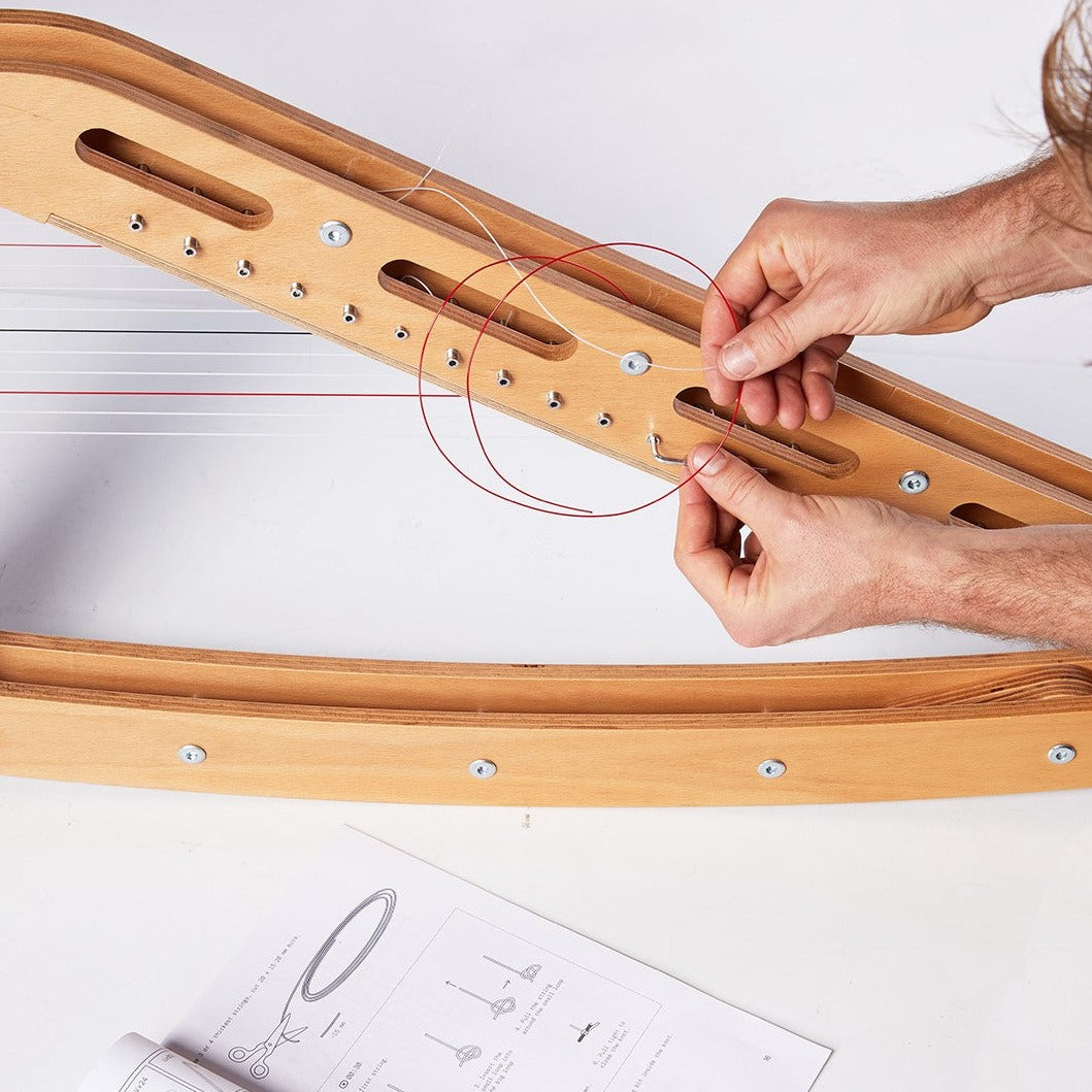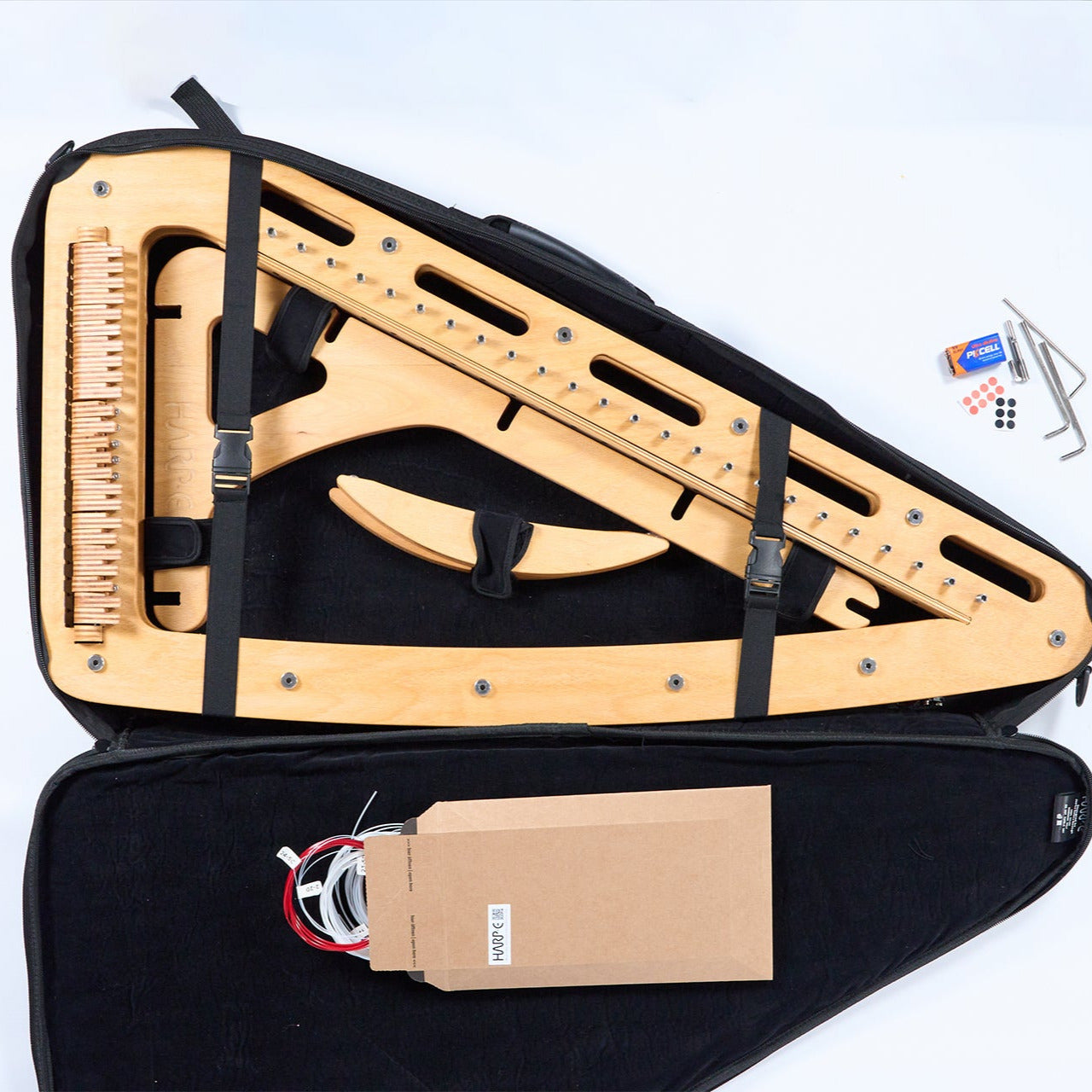 Pre-assembled – string and regulate it yourself. This option offers a high-quality electric harp at an accessible price. If you have some time to spare, stringing your own harp is a rewarding learning experience. We provide a clear manual and video guide to help you learn this valuable skill. If you already know how, stringing will be a breeze.